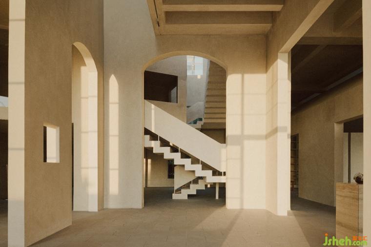 建筑外墻均以白色為主調(diào),墻面細(xì)密緊實(shí)的紋理,在回響遙遠(yuǎn)的記憶訴說。攝影藝術(shù)空間設(shè)計(jì)墻體以石磚砌筑,山海相棲,默默的摩挲在海天呼吸之間,描摹風(fēng)的姿態(tài)。石磚的肌理刻畫記憶回溯,質(zhì)樸的美感謄寫建筑的時(shí)間舊聞。
