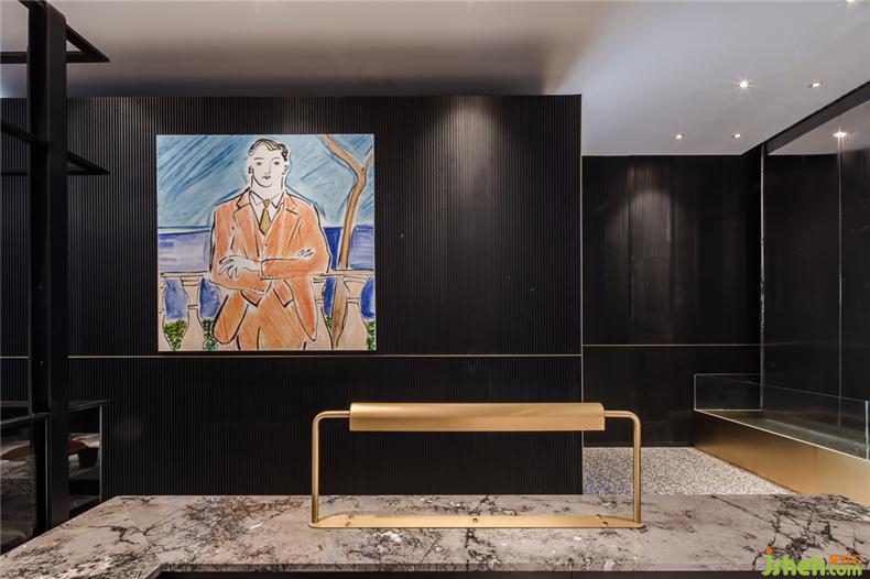 天花射燈與造型臺燈組合,墻面通過洗墻效果突出機理的同時提供了環(huán)境光,造型臺燈在工作維度上提供有效補充,為空間增加層次感。墻面與臺面的色彩對比同時形成強烈的視覺沖擊。餐廳設計