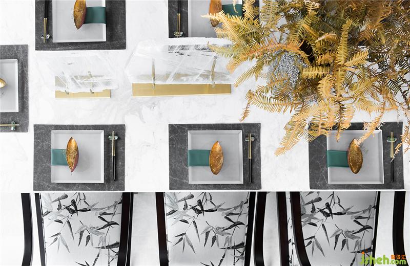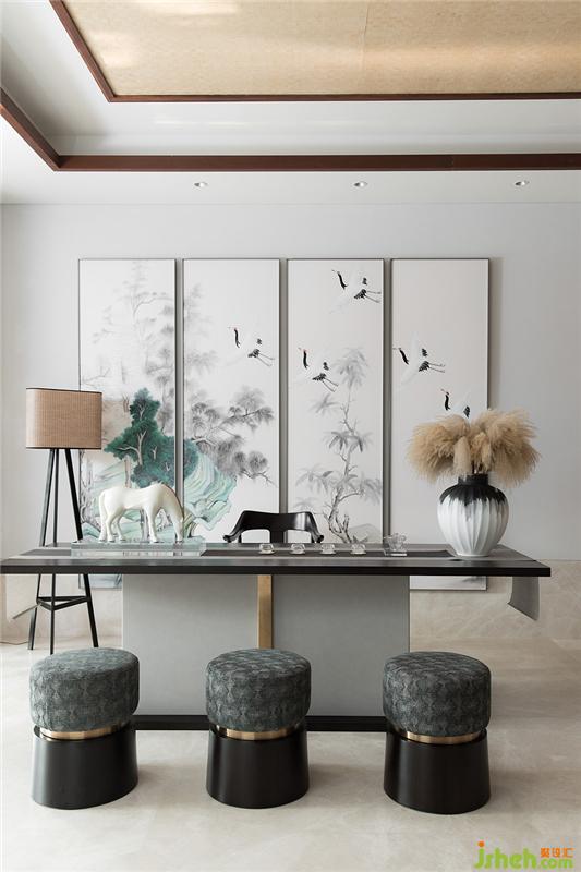 韋美在玄關(guān)和餐廳的處理上,大膽選擇雅致水墨畫(huà)來(lái)中和整個(gè)空間,用來(lái)打破過(guò)于繁瑣的硬裝造型所帶來(lái)的沉悶。餐廳以當(dāng)代美學(xué)格調(diào)的構(gòu)圖與鋪陳,凸顯設(shè)計(jì)筆觸之下的意境之美。