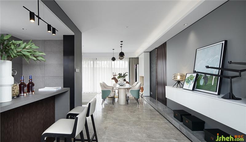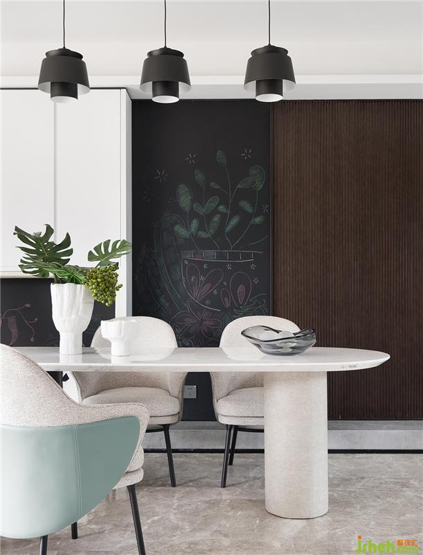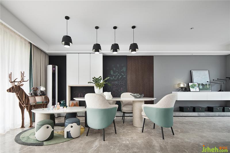 在客廳打造一個趣味的互動空間,靈感來自于森林的綠意陽光以及小動物。讓藝術(shù)融入到生活的每個細(xì)節(jié),每個瞬間。生活的另一個重心當(dāng)然就是孩子們,為了培養(yǎng)孩子的創(chuàng)造性,我們在這個家安排了秘密的小機(jī)關(guān)。比如餐廳墻壁上的“黑板”,鼓勵孩子們可以進(jìn)行有趣的創(chuàng)作任由孩子在黑板上自由發(fā)揮自己想象的世界。