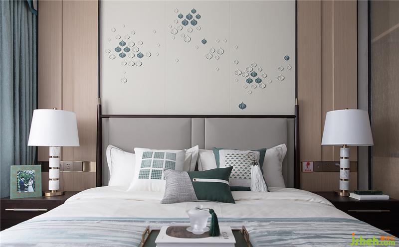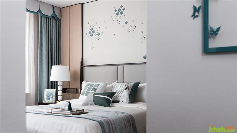 主臥屏風(fēng)帶著點(diǎn)點(diǎn)春色,煙雨初歇,留白間是“草色遙看近卻無(wú)”的意境。淺淺花草間有蝴蝶乘風(fēng)而來(lái),家具選款沉靜大氣。