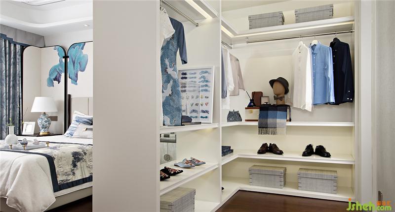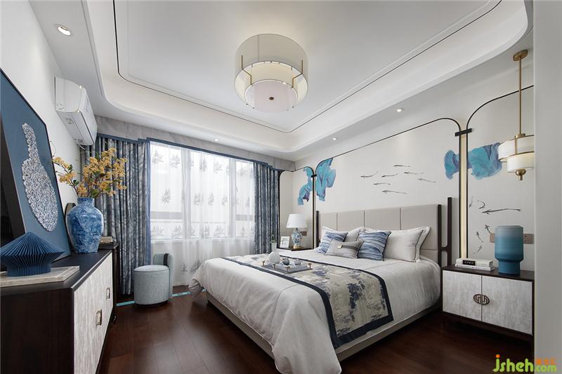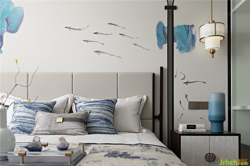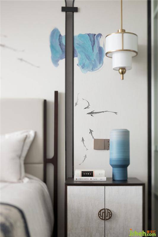 如果說(shuō)元青花是雄渾大氣,那么明代永宣青花就是清雅樸素,超凡脫俗。主臥設(shè)計(jì)上,設(shè)計(jì)師融入明代永宣青花的特點(diǎn),屏風(fēng)錯(cuò)落的散暈斑點(diǎn)有如水墨畫的墨暈,淡淡暈染出超然之境。雅致簡(jiǎn)潔的家具在有序的坐落間有水墨青花散落開來(lái),沁染心神。