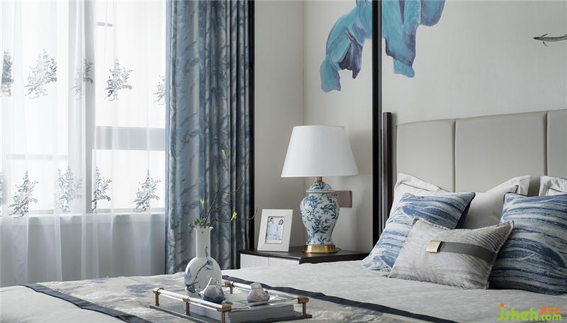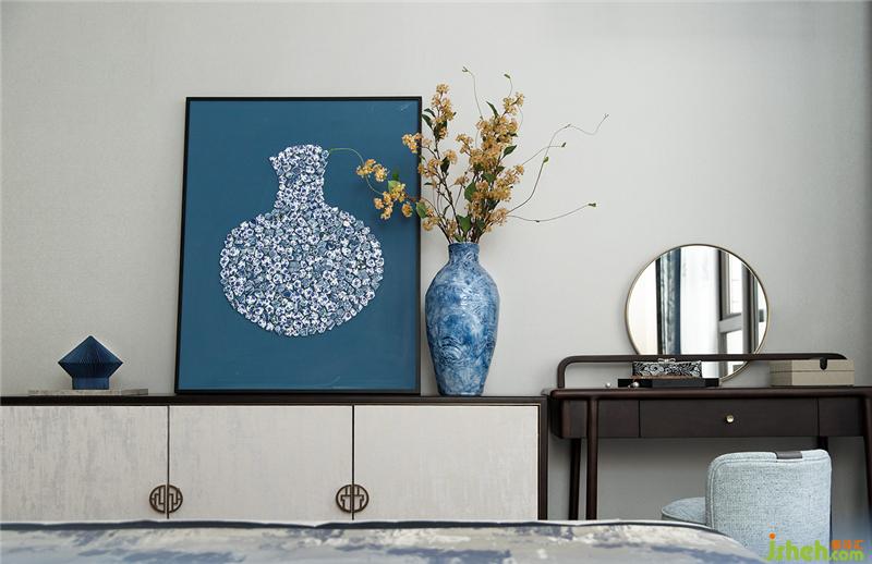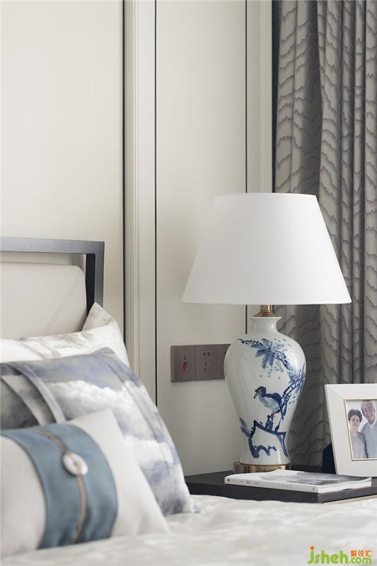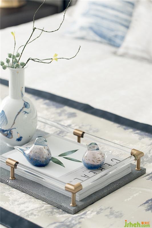 清代青花,歷經(jīng)元、明兩代后,洗盡鉛華,古樸精巧。長(zhǎng)輩房的設(shè)計(jì)以樸實(shí)為主要基調(diào),家具陳設(shè)干凈簡(jiǎn)練,裝飾品上體現(xiàn)清青花“青分五色“的多樣化細(xì)節(jié),豐富祥和。