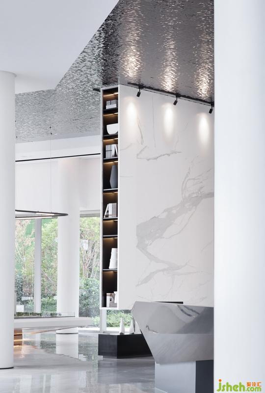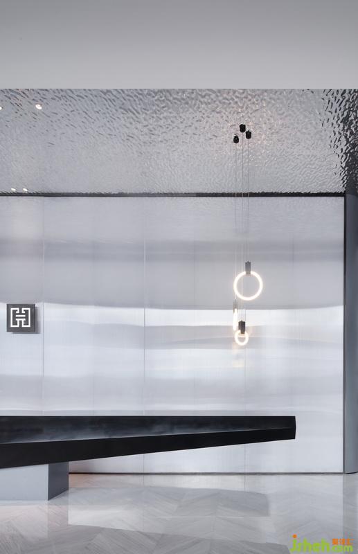 步入接待大廳,空間整體通透,不設分區(qū)隔斷。在一片乳白色的墻面下,是棱角分明的石材臺面,簡潔明凈,毫無它飾。“光是有生命的,從早到晚隨著光線變化,空間中的光影流轉(zhuǎn)可以讓你在大理石的質(zhì)感中感受到時空的流動,一種靜謐而無垠的空間感油然而生。”設計師如是說。