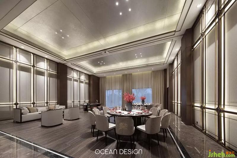 道家認為:“天圓”心性上要圓融才能通達;“地方”命事上要嚴謹條例。活動室的設(shè)計于此為理念,將兩側(cè)對應的不銹鋼背景“圓形”造型與“方形”天花進行理性地組合,創(chuàng)造出自然獨特、和諧的美?!鞍氡谏椒看髟?,一盞清茶酬知音”,茶室的設(shè)計是設(shè)計師給賓客構(gòu)建一方悠閑的天地,讓身處其中的人在談笑間感受自然,并與之共鳴。