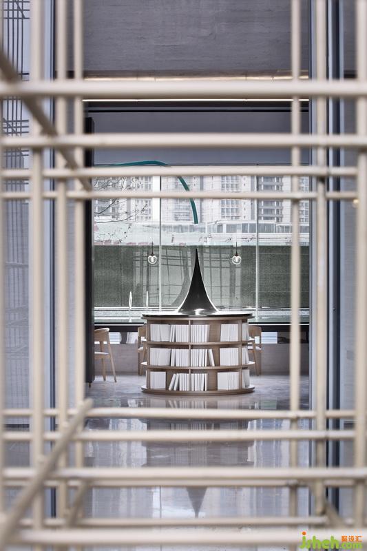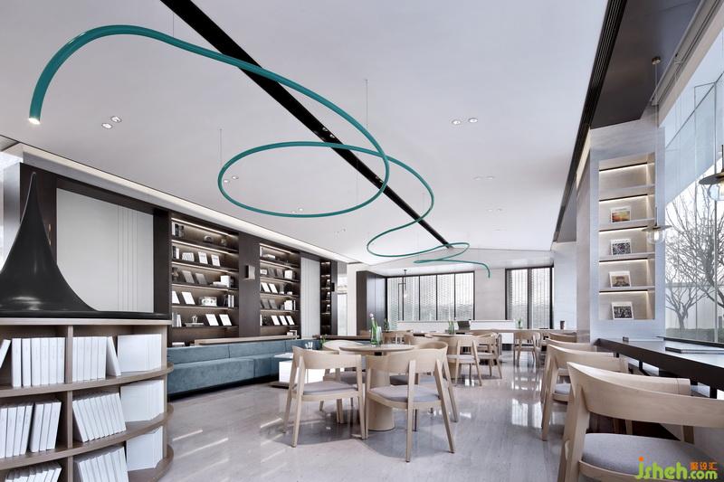 咖啡書(shū)吧的天花上,設(shè)計(jì)師用一條飄蕩的藍(lán)色水帶徜徉于空間中,邀請(qǐng)每一位來(lái)訪者入座,共赴一場(chǎng)當(dāng)代曲水流觴的文化之旅。