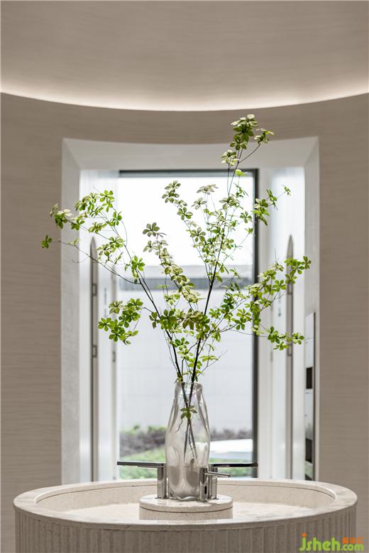 設(shè)計師在有限的空間內(nèi)巧設(shè)諸多門洞,從曲線到圓點,讓感性的內(nèi)核被理性的計算推波助瀾成為墻面結(jié)構(gòu),形成和諧的視覺效果。引入植物裝置,通過設(shè)計的藝術(shù)再造,點綴著充滿勃勃生機的綠意,成為空間里可觸碰可感知的美好。