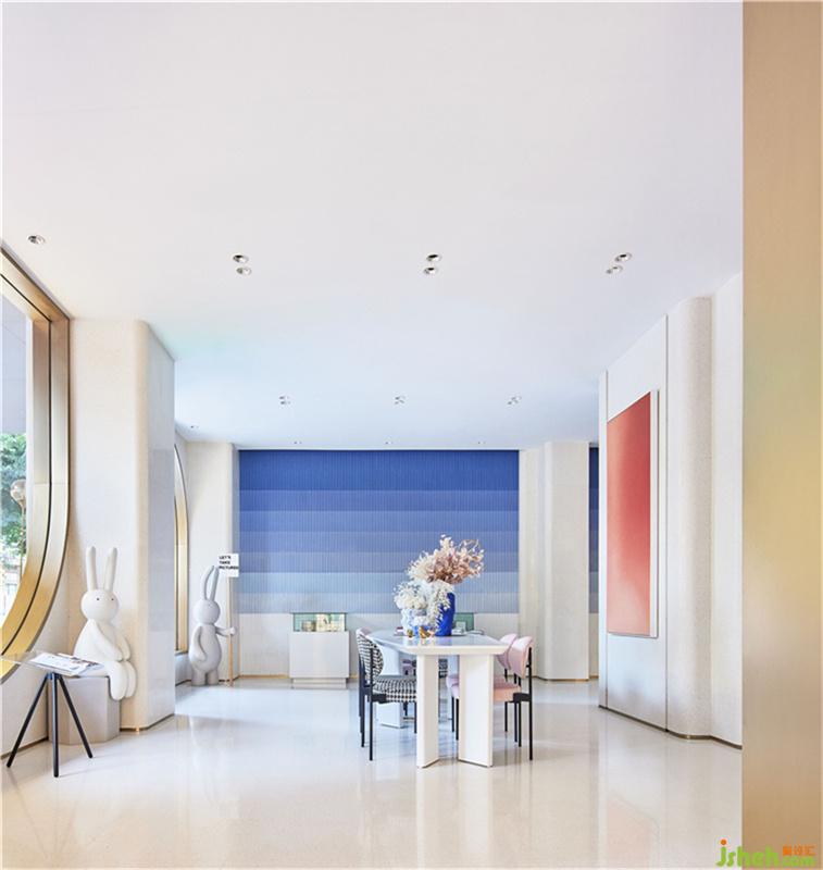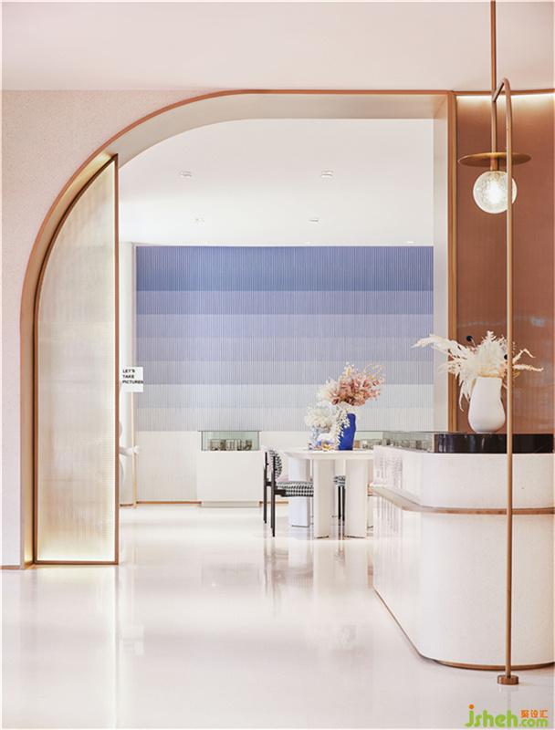 臨街的座位借助金屬線條和幻彩玻璃的光學(xué)性能,打造的連續(xù)曲面景墻,營(yíng)造出夢(mèng)幻色彩的沿街展示面,一方面以柔美的曲線來(lái)進(jìn)行設(shè)計(jì)語(yǔ)言表達(dá),引導(dǎo)著人們開(kāi)啟奇幻夢(mèng)中之旅。另一方面,在白色極簡(jiǎn)的基礎(chǔ)上,利用門店全景觀視野,打開(kāi)了室內(nèi)與室外清晰共話。