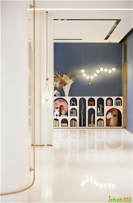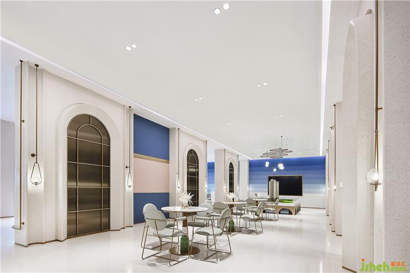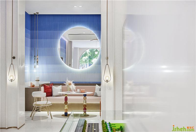 自然界中有形的東西是流動的,但是構成這些有形物質的“形式”或“理念”卻是永恒不變的。在前廳中,設計師引入“兔子精靈IP”建造入口處景觀,加以“伊甸園的果粉與黛藍”氛圍營造,形成與顧客良好的步入體驗,串聯(lián)起童話夢幻場景,演繹一幅無限貼近主題的藝術速寫。