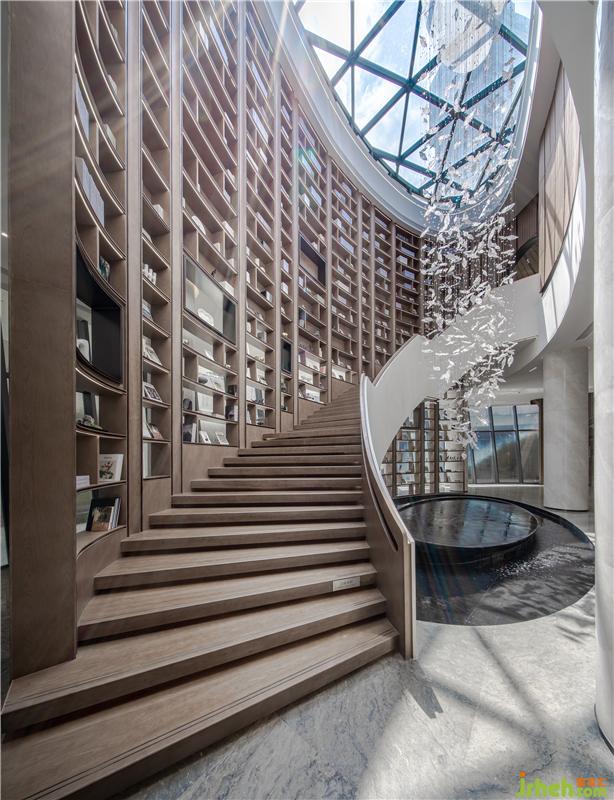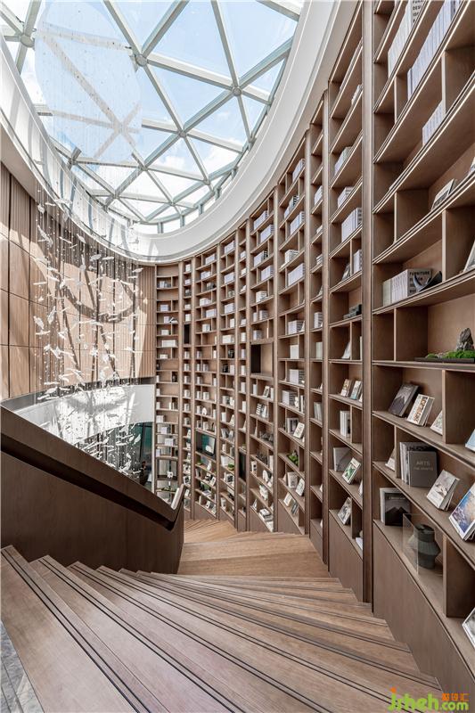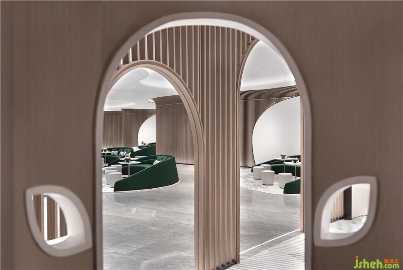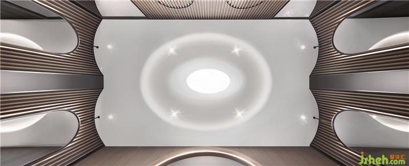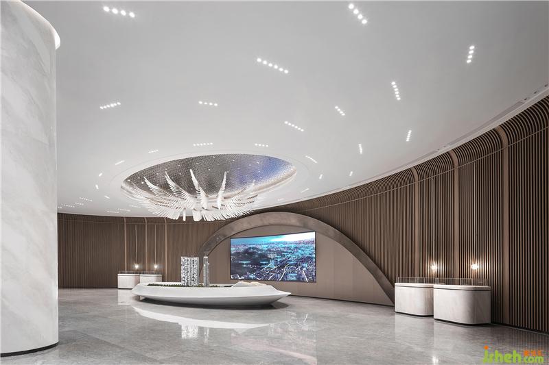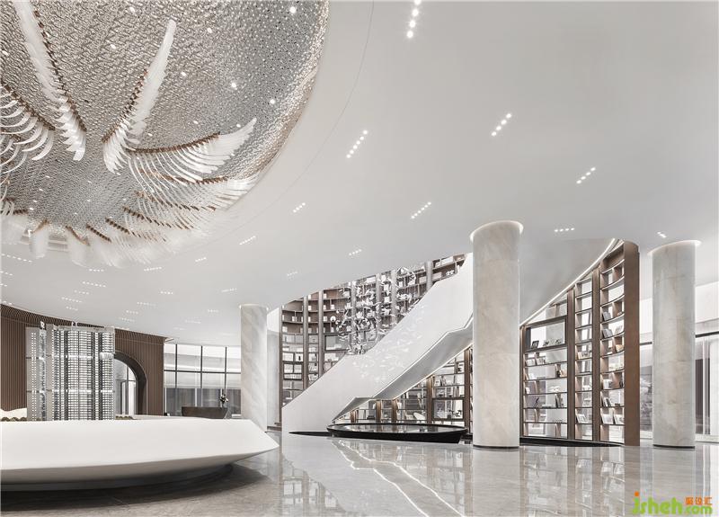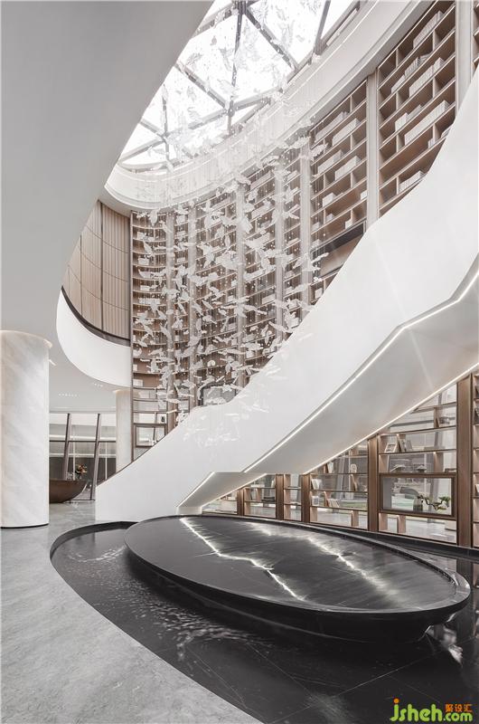 曲線藝術與自然生態(tài)相融,勾勒空間的起承轉合。設計融入黎曼幾何的不規(guī)則流暢線條,引入《翼》的藝術裝置,寓意翱翔天際,展翅未來。