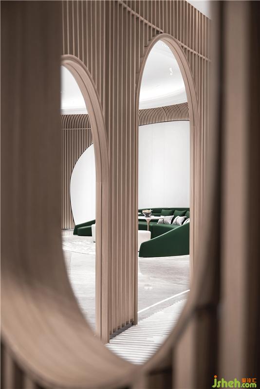 奧迅意欲創(chuàng)造一種純粹的設計語言,尊重與融入自然。設計師賦予空間之間可窺探、可流動的層次關系。陽光穿透玻璃撒滿大廳,來訪者向光而進,繼續(xù)探廣州售樓處設計索幻光松林之旅。