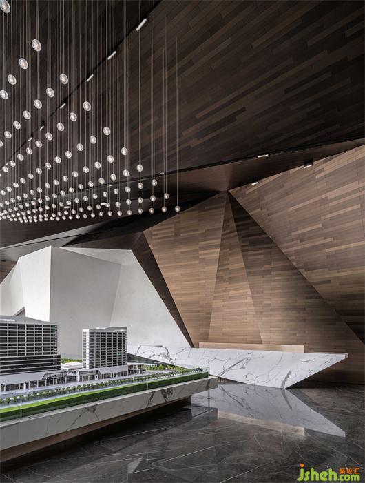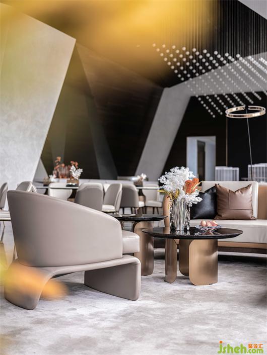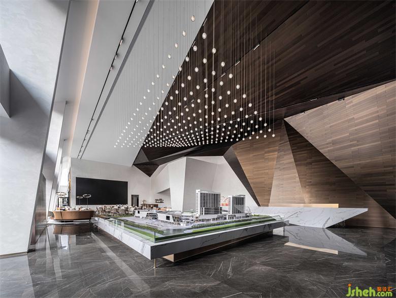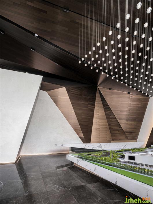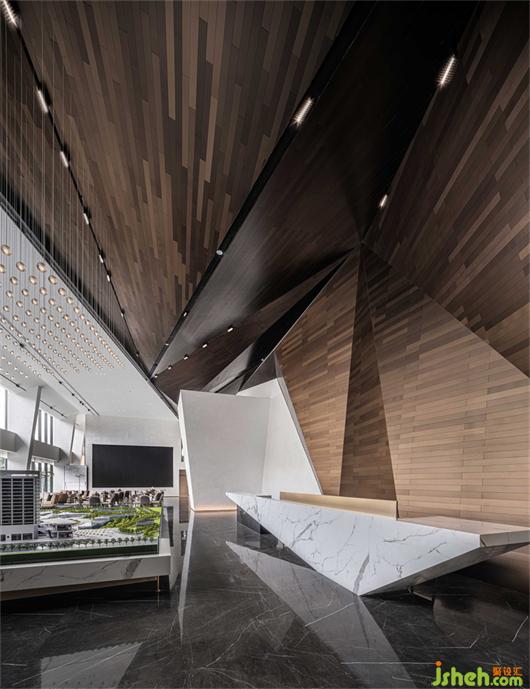 接待大廳以鏡面不銹鋼與幾何金屬防火板的碰撞融合,構(gòu)成空間的多維度群山造型呈現(xiàn)。沉穩(wěn)的大理石在廣博的紋理中,嵌入黑金漸變的色調(diào),婉若天空微亮前的山巒金頂,使觀者置身其中,產(chǎn)生對(duì)歷史記憶的共鳴。