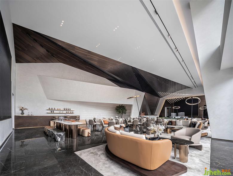 售樓處設(shè)計洽談區(qū)以山谷地形為基礎(chǔ),解構(gòu)地貌肌理層次,融會詩意化藝術(shù)細節(jié)和穿透關(guān)系的視覺光影,交織出一個簡潔純粹的會客交談空間。