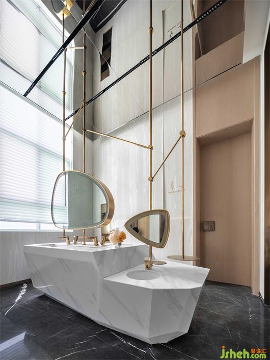 售樓處設(shè)計材質(zhì)的搭配令空間更有韻味。洗手間將自然素材與新型材料的結(jié)合,使空間具有干凈清爽的前衛(wèi)感,也有不失藝術(shù)與文化氣息。