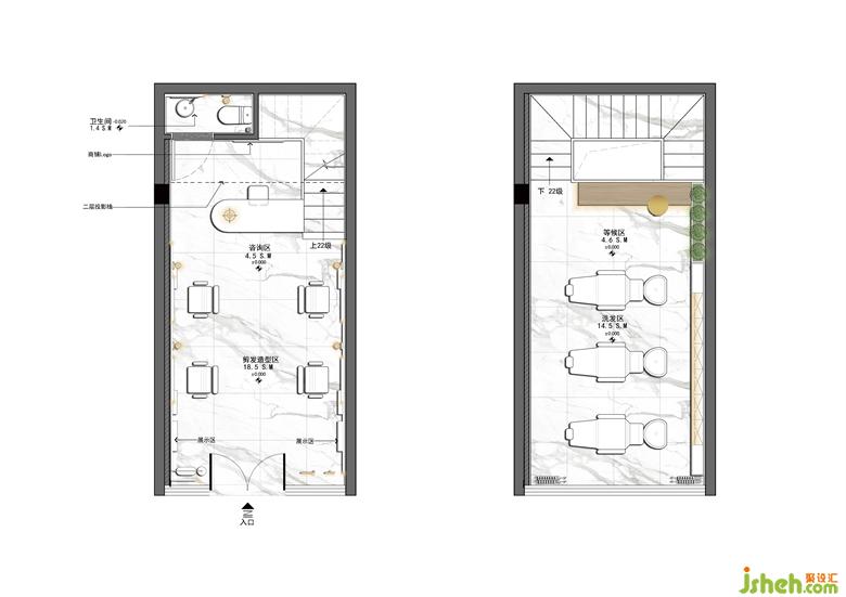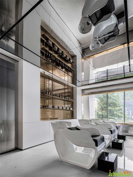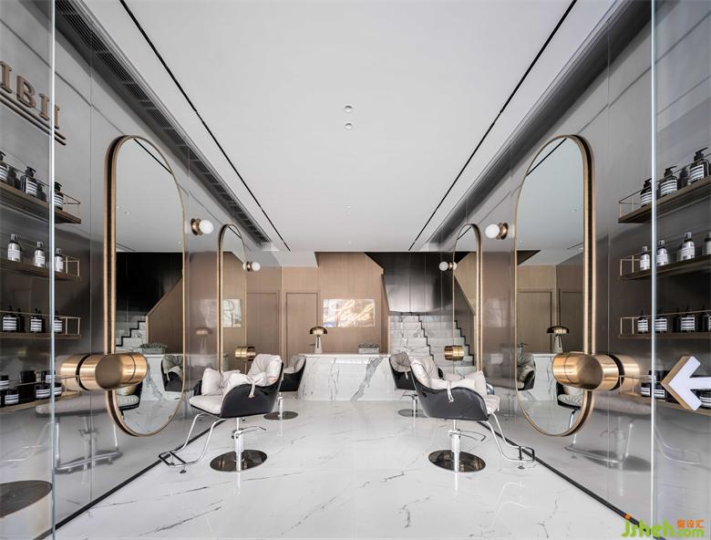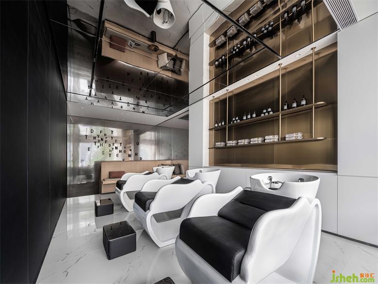 金色隱喻昔日山脈的聯(lián)系,黑色代表對未來的敏銳探索。在美發(fā)沙龍商鋪設計中,奧迅選取沉穩(wěn)的黑金來打造摩登精致主義與返璞自然的平衡。