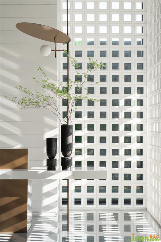 剛?cè)腴T廳,便見(jiàn)晨光透過(guò)整面仿古鏤空方格疊合墻體,間隔室內(nèi)外的虛實(shí)之別,一步一景,循著光的斑駁,呼吸著浸潤(rùn)澄湖的自然氧氣,詩(shī)意開(kāi)啟。