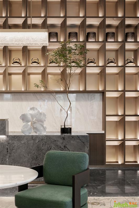 依嶺南儒雅文化為特點(diǎn),結(jié)合售樓部設(shè)計(jì)的情景模式的功能需求,通高的鏤空方形石材盒子組成幕墻,透過自然光影的輝映,以無限的靜默將室內(nèi)外的界限完全打破,無限延伸可視域范圍,城景合一,建景相融的場所精神。后場以禮序?yàn)樾?,呈現(xiàn)中國五進(jìn)歸家之禮,層層遞進(jìn),雅趣橫生。