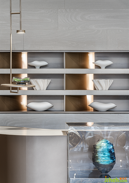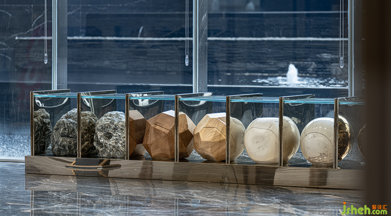 售樓部設(shè)計(jì)是城市居住的價(jià)值縮影。藝術(shù)裝置上山石材質(zhì)的進(jìn)化,從不規(guī)則形態(tài)到極致圓滑的球體,粗獷石料到前衛(wèi)金屬,以更趨于細(xì)膩的材質(zhì)表達(dá),暗喻城市新舊動(dòng)能轉(zhuǎn)換中蓬勃發(fā)展。