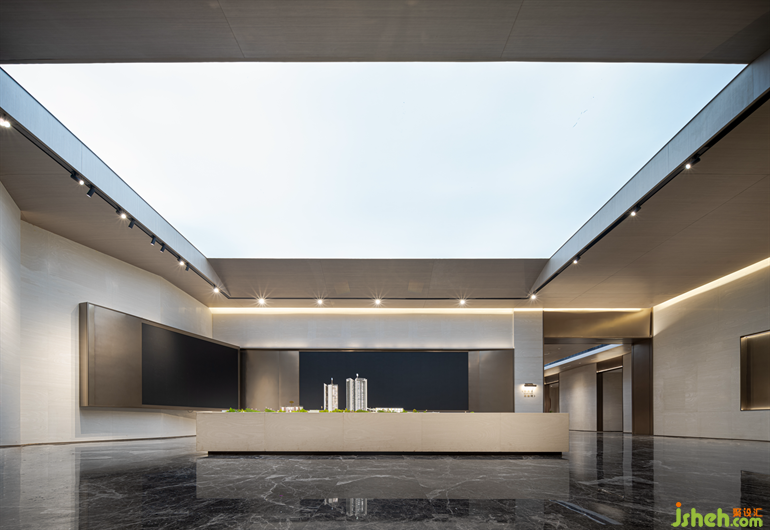 售樓部設(shè)計(jì)以“園”開(kāi)篇,引入自然成為空間氣韻。借助隱藏在大理石的塊面間燈帶,與戶(hù)外景觀(guān)產(chǎn)生流瀉的光暈,在溫暖與寧?kù)o包裹下的場(chǎng)景,激發(fā)觀(guān)者對(duì)美好情感的感知。