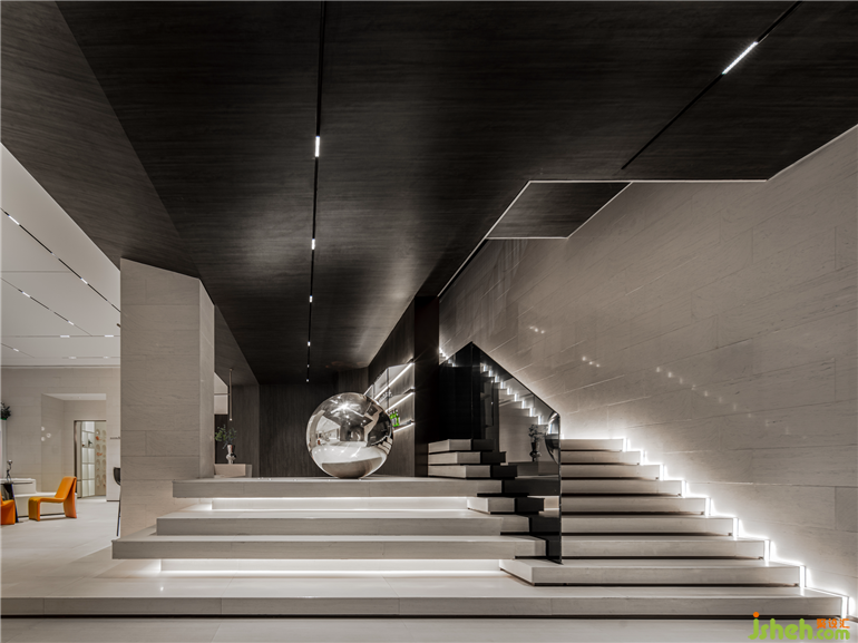 售樓部設(shè)計以光為媒介,清冷的不銹鋼鏡面材料的運用,以一種可感知的立體形態(tài)起承轉(zhuǎn)合,組成藝術(shù)樓梯的極簡美學(xué)要素,與上下樓梯的觀者在動靜之間互動,帶來視覺的多重感官享受。