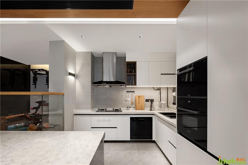 廚房設(shè)計不畏懼白色,因為我們將重點,更多放在如何維持空間干凈整潔、通透明朗的要求上,并且在烹飪區(qū)域設(shè)置了不同的燈光效果,解決采光偏弱這一問題,這兩點對于長期使用的開放式空間來說尤為重要。