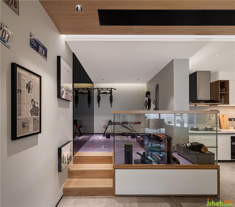 除此之外,男主人也是個健身達人,高爾夫、滑雪等各項運動都是他的心頭好,能在家中擁有一個裝備齊全的運動場所,對他來說再滿足不過。因此,這個主要以健身為主的功能性區(qū)域,首先用玻璃隔斷很好的區(qū)分開其他空間,其次使用半開放式“階梯擂臺”的設(shè)計手法,表現(xiàn)出運動賦予生命勇敢堅韌的意義。