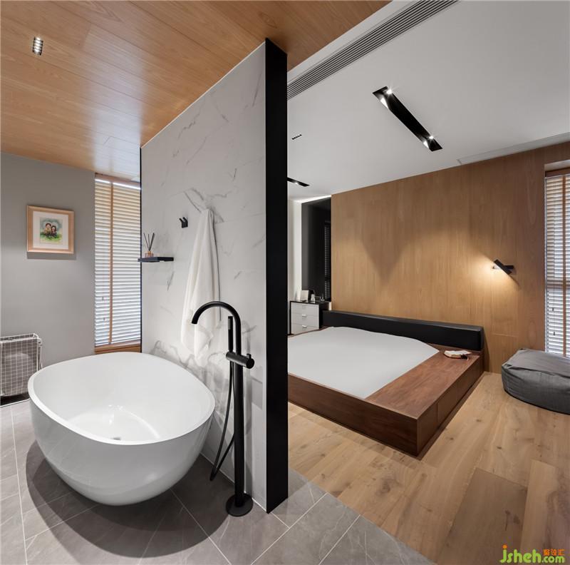 當然,主臥與主衛(wèi)之間的開放式設(shè)計,依然延續(xù)了空間簡約大方的設(shè)計邏輯。冷色調(diào)大理石瓷磚與暖色調(diào)木質(zhì)地板拼接而成的肌理感,形成鮮明而有趣的對比。