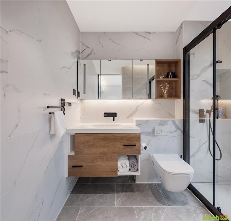 在黑色滑動(dòng)門背后是一個(gè)純凈的客衛(wèi),材質(zhì)的選用,是對(duì)于原始形態(tài)的推崇,加上精密打磨,表現(xiàn)出冷靜、光滑的獨(dú)特肌理,看似冰涼,卻極易牽動(dòng)情思。值得一提的是,整個(gè)空間并沒(méi)有單獨(dú)設(shè)置公共衛(wèi)生間,而是將兩間臥室都當(dāng)做套房處理,一方面是對(duì)客人的溫柔關(guān)照,另一方面,是向往自由隨性、與萬(wàn)物和諧共處的生活映照。