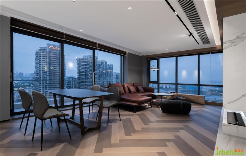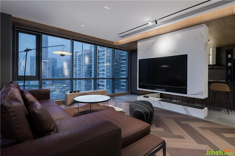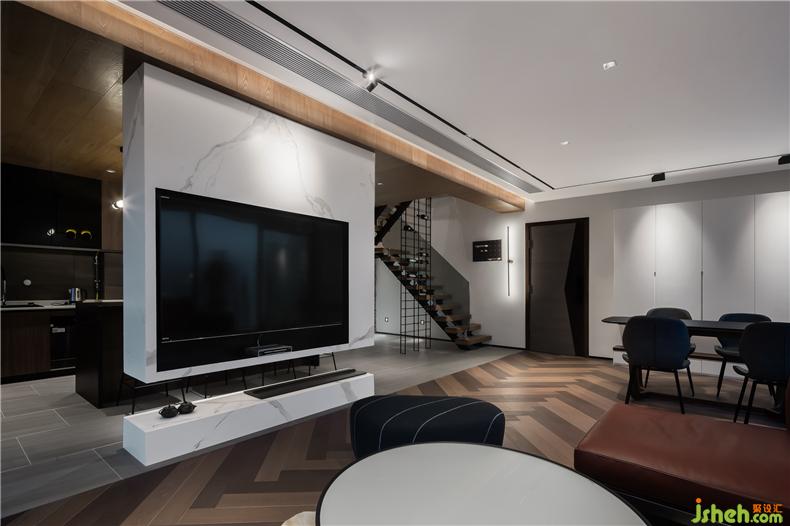 一層主要集中在對(duì)開(kāi)放式公共區(qū)域的空間布置規(guī)劃,室內(nèi)設(shè)計(jì)師并利用原木色與白色,將餐廳與客廳通過(guò)上下色感與紋理反差,半隔斷式大理石電視背景墻區(qū)分開(kāi)。180°落地窗讓城市景觀與晝夜之間變幻的自然光線落入屋內(nèi),讓人享受在大城市里愜意、輕慢、舒暖的生活節(jié)奏。