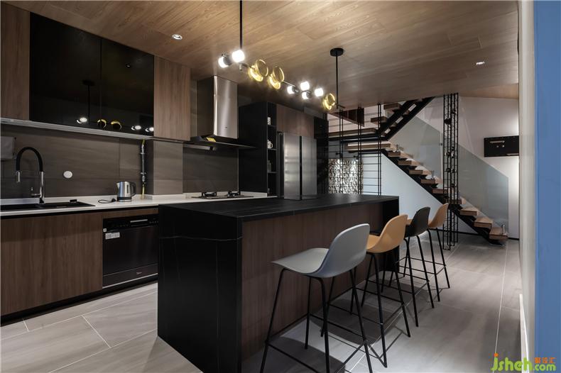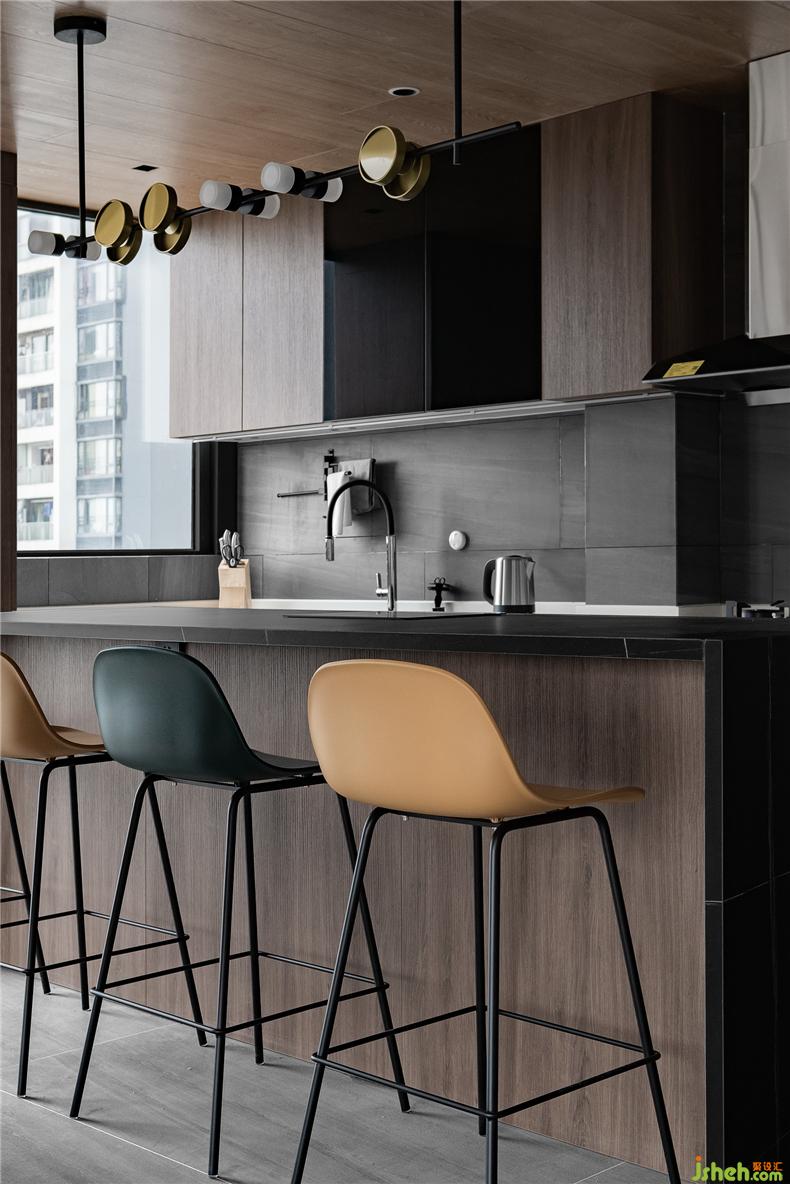 餐廳與開(kāi)放式廚房在整個(gè)空間中,是為都市人準(zhǔn)備的放松身心之地。室內(nèi)設(shè)計(jì)師白黃交織的個(gè)性燈光與高腳椅照映著空間氣質(zhì),在吧臺(tái)位置處,顯得小資而具有生活情調(diào)。
