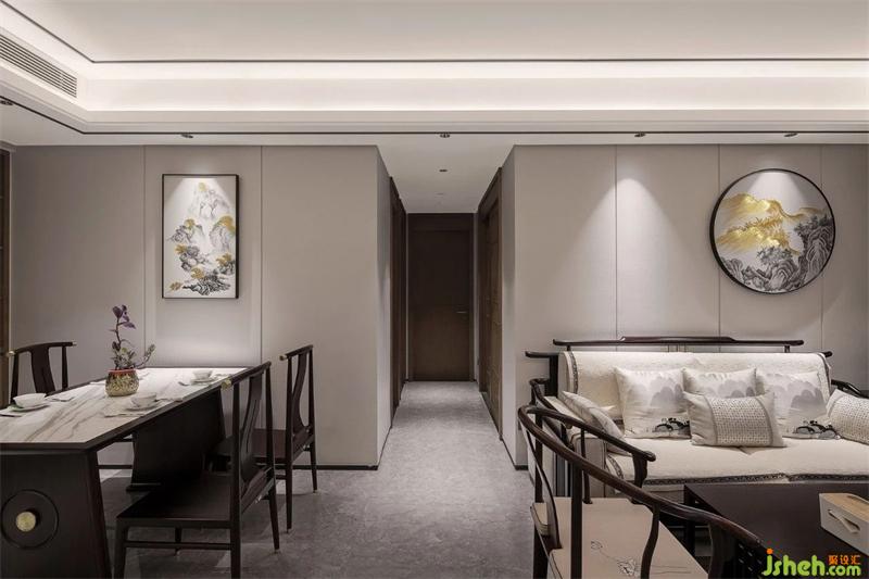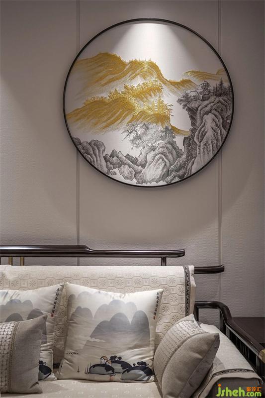 這份靈動皆源于東方元素,山水自然附著在畫作、抱枕上,對應大理石水墨紋理,再結(jié)合中國工藝美學、結(jié)構美學,以現(xiàn)代手法演繹出古典詩意,讓人與空間、與自然、與文化共鳴,譜寫屬于居者的故事。