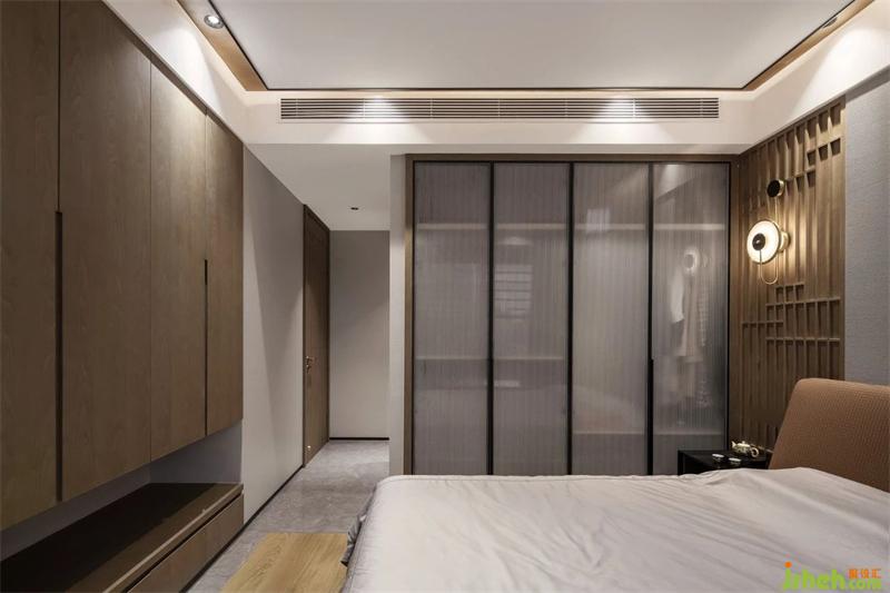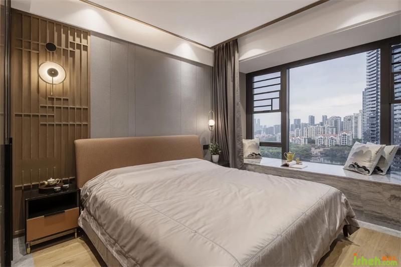 “靜聽(tīng)四季詩(shī)吟,坐看云舒云卷”主臥在風(fēng)格上承接了設(shè)計(jì)的東方主題,但更加獨(dú)立且幽靜,仿佛是城市中的一舍隱居,形式上也更深沉富有質(zhì)感。