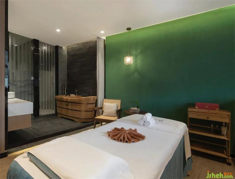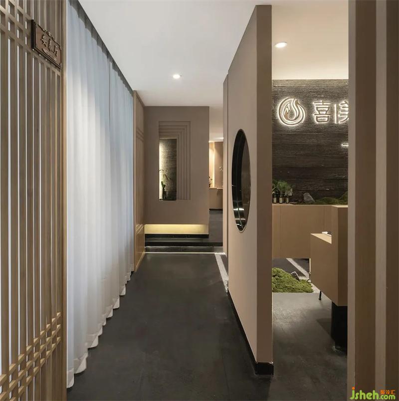 當(dāng)顧客走到外廊,映入眼簾的是干凈的色彩,養(yǎng)生館設(shè)計以及柔和的燈光,緩步而行,佇足館前,蘊(yùn)繞其中的自然氣息瞬間包裹身心,令人放松,這也是設(shè)計想要營造的整體空間氛圍,同時結(jié)合中國文化底蘊(yùn)和會館的功能屬性,在快節(jié)奏的城市生活中,打造一隅靜穆祥和之天地,沉浸于禪境詩境,感受物我兩忘的悠然愜意。