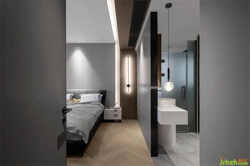主衛(wèi)與衣帽間一體,在單獨(dú)的動(dòng)線上,也更符合居者的生活習(xí)慣和空間的功能延續(xù)性,洗手臺(tái)的結(jié)構(gòu)也做了特別的裝修設(shè)計(jì),搭配垂掉的熔巖燈,可以同時(shí)滿足兩個(gè)區(qū)域的置物需求,十分別致。