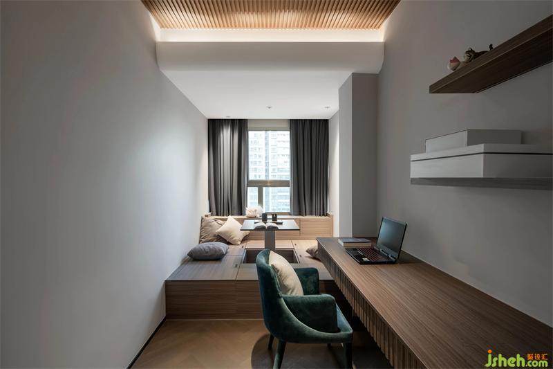 木,喻意沉厚穩(wěn)重,又表象自然,運(yùn)用在書房最合適不過,書桌、架子、榻榻米、可上下浮動(dòng)的桌子,以及可收納的木質(zhì)窗臺(tái),通過理智與情感、功能與美觀、動(dòng)與靜的結(jié)合,詮釋著空間獨(dú)有的氣質(zhì)。
