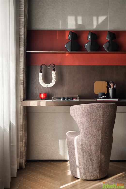 對“義烏紅”的演繹,是對在地精神的回溯,于是幾何的變形、體塊的重疊、材質(zhì)的復(fù)合,樣板房設(shè)計構(gòu)成了限量版的生活。墨色與金色的無序暈染,頗有鵲羽鎏金、花脈雋永的深意。