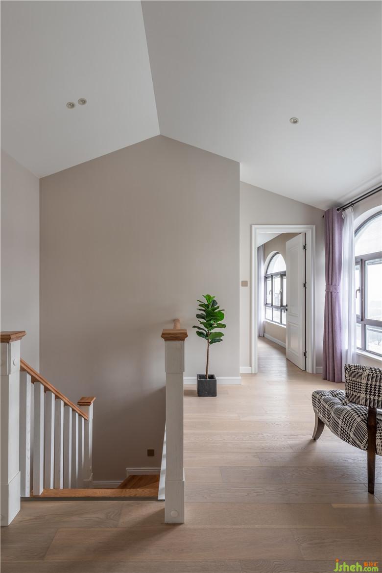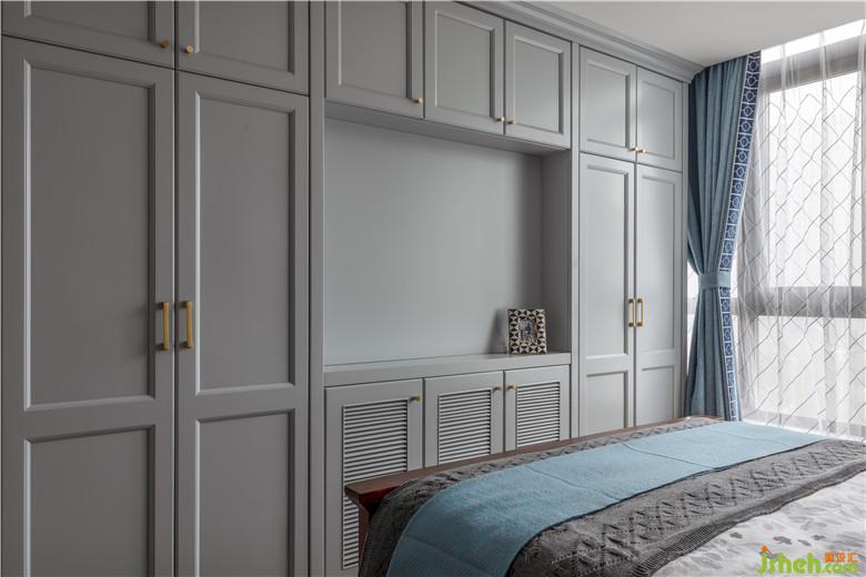 男女主喜歡在睡前翻閱一些書,因此室內設計師沒有選擇成品床頭柜,而是根據(jù)他們這個生活習慣設計了對稱書架式床頭柜,有充足的空間納入孩子的相片、常用書籍、助眠香薰蠟燭等等物件。色調上尊重了女主喜歡的紫色系,營造浪漫的休憩氛圍。