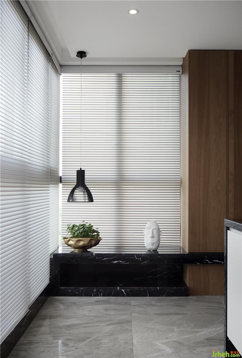虛與實之間,玻璃與百葉之間,以光線作為介質(zhì)迎進室內(nèi),在不同的時間段裝點著入戶端景。黑與白、金屬與石膏、人像與銅錢草,展現(xiàn)出妙趣橫生的空間表情。