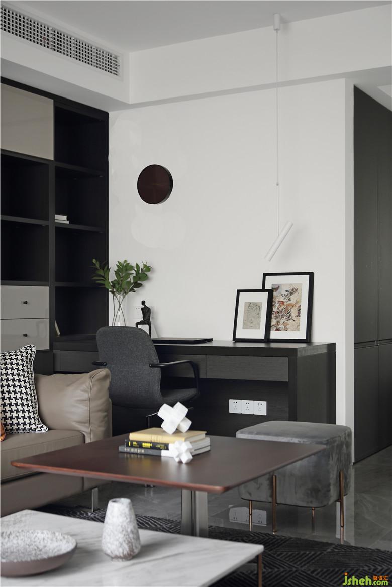 由于生活空間的規(guī)劃,原本的書房區(qū)域作出了讓步,但是業(yè)主說,生活不能缺少閱讀。于是室內(nèi)設(shè)計師特別設(shè)計了整面墻的書架,加上角落的書桌功能,使得客廳成為一個集會客、娛樂、閱讀、工作的多功能區(qū),實用又可靠。