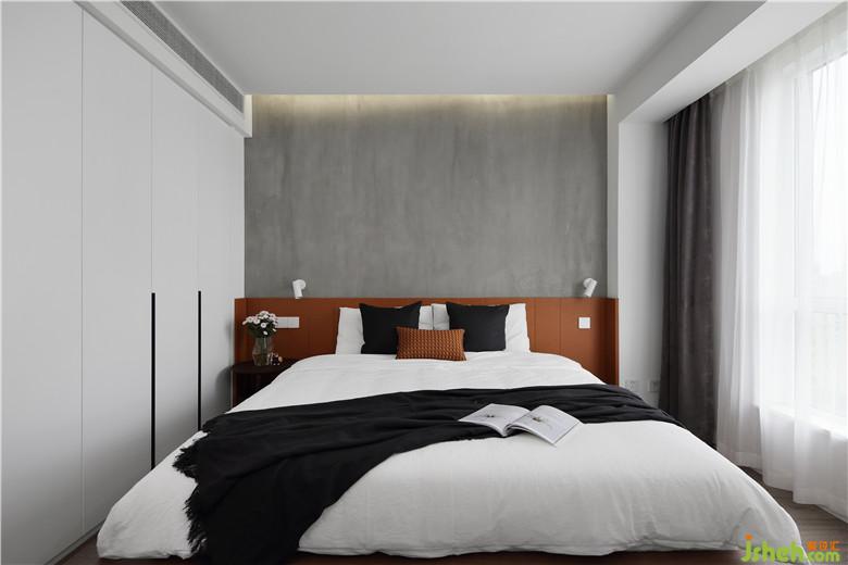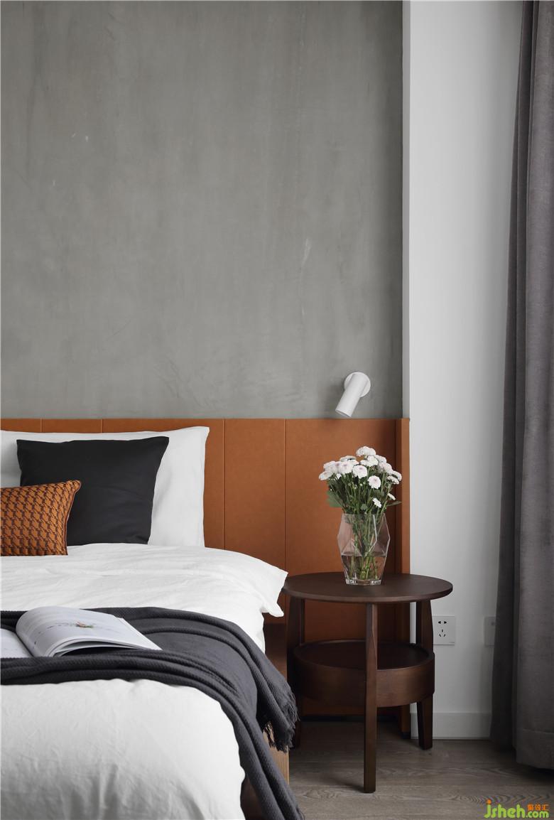 穩(wěn)重內(nèi)斂的氣質(zhì)十分契合屋主夫妻二人的品位,橙色系的床頭硬包專門做成一半的設(shè)計并配以同色系的千鳥格紋靠枕,有一整面的衣柜來滿足日常儲物需求。室內(nèi)設(shè)計師沿用主色調(diào)的黑白灰配以橙色系點亮視線,呈現(xiàn)沉穩(wěn)安靜卻又都市化的臥室空間。一捧淡雅的花束,陪伴你一整晚的好睡眠。