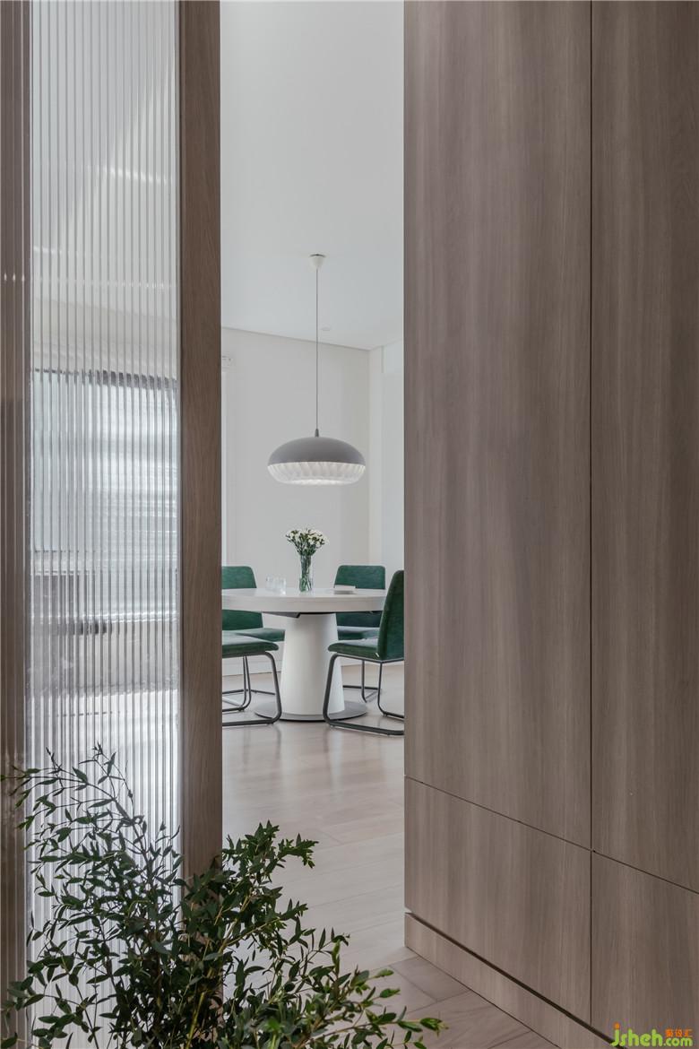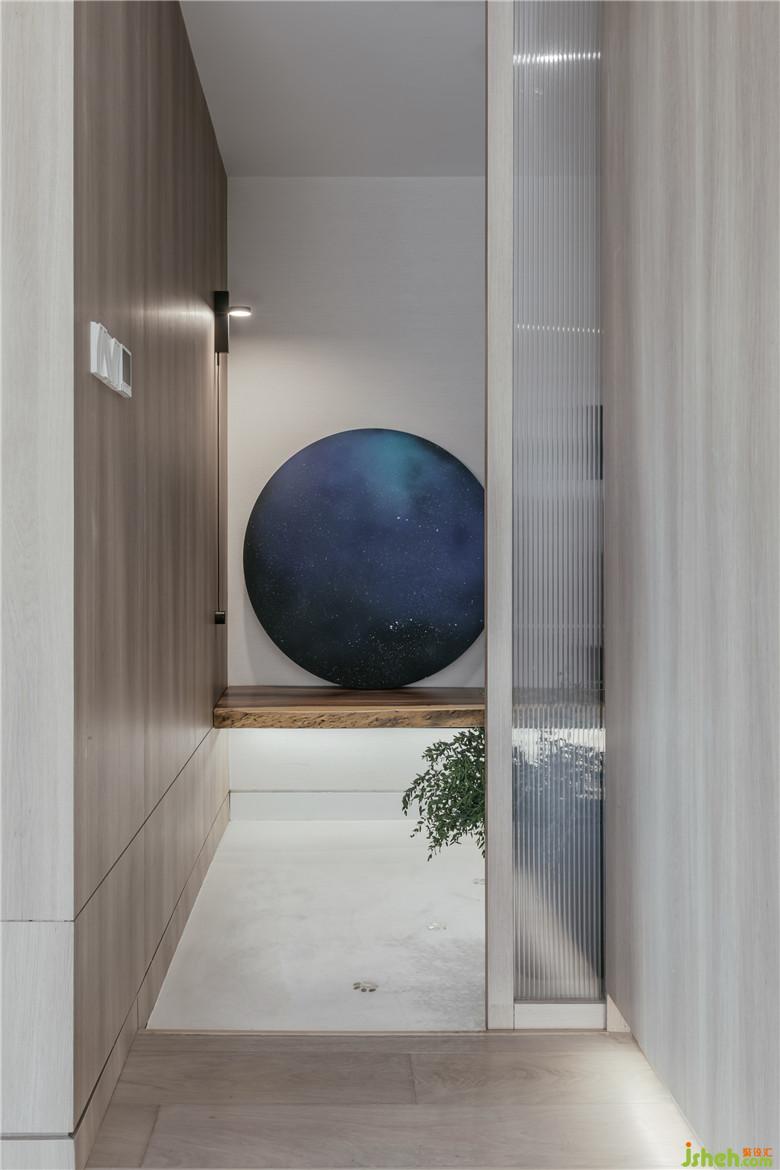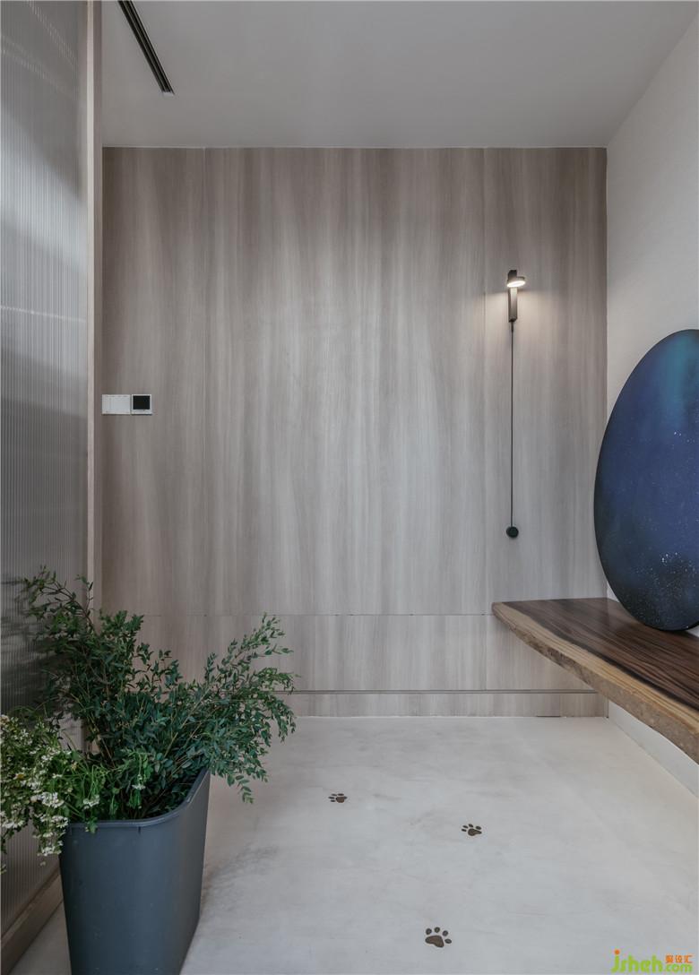玄關(guān)的長虹玻璃移門后面是玄關(guān)收納,衣服、鞋子、包包都可以在進(jìn)門時(shí)隨手放好。地坪拐彎處和室內(nèi)地板其實(shí)有一個(gè)微小的落差,避免塵土帶進(jìn)家中。