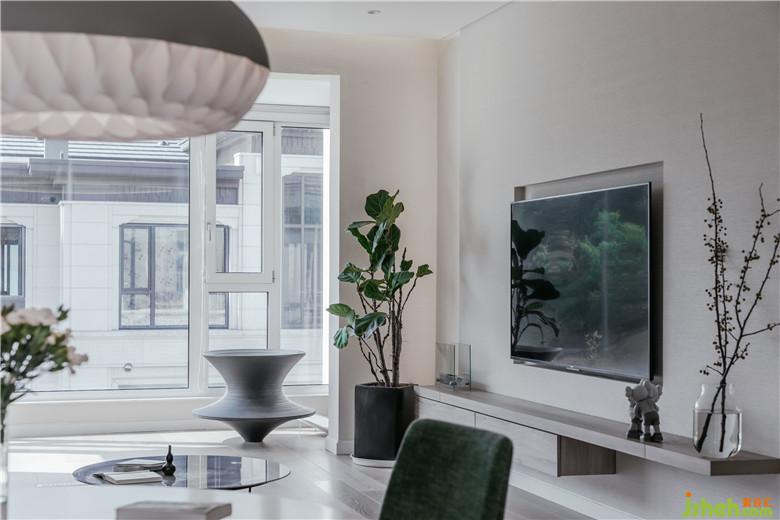 思考的空間對于擁擠的城市來說,是一種居住選擇。白色、灰色、木色和綠色,一切都是淡淡的,沒有其他多余的色彩與裝飾。背景墻、氛圍燈光和沙發(fā)紋理一起呈現(xiàn)出立體化的視覺思維。
