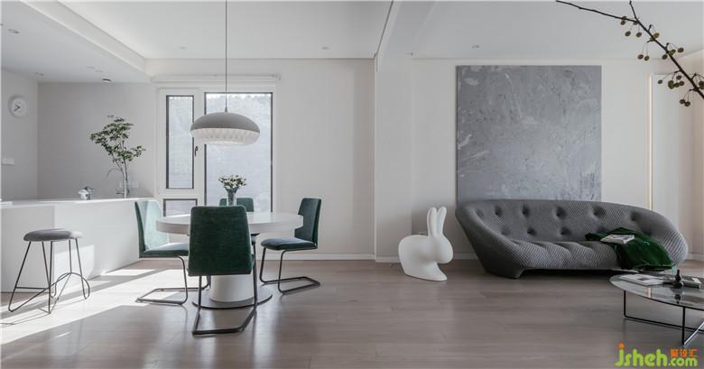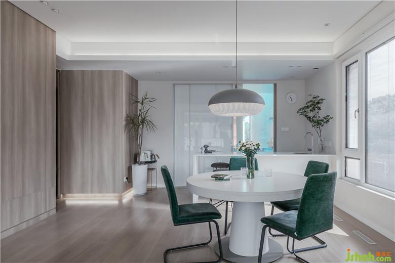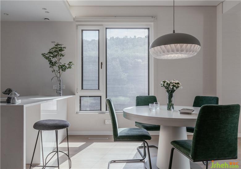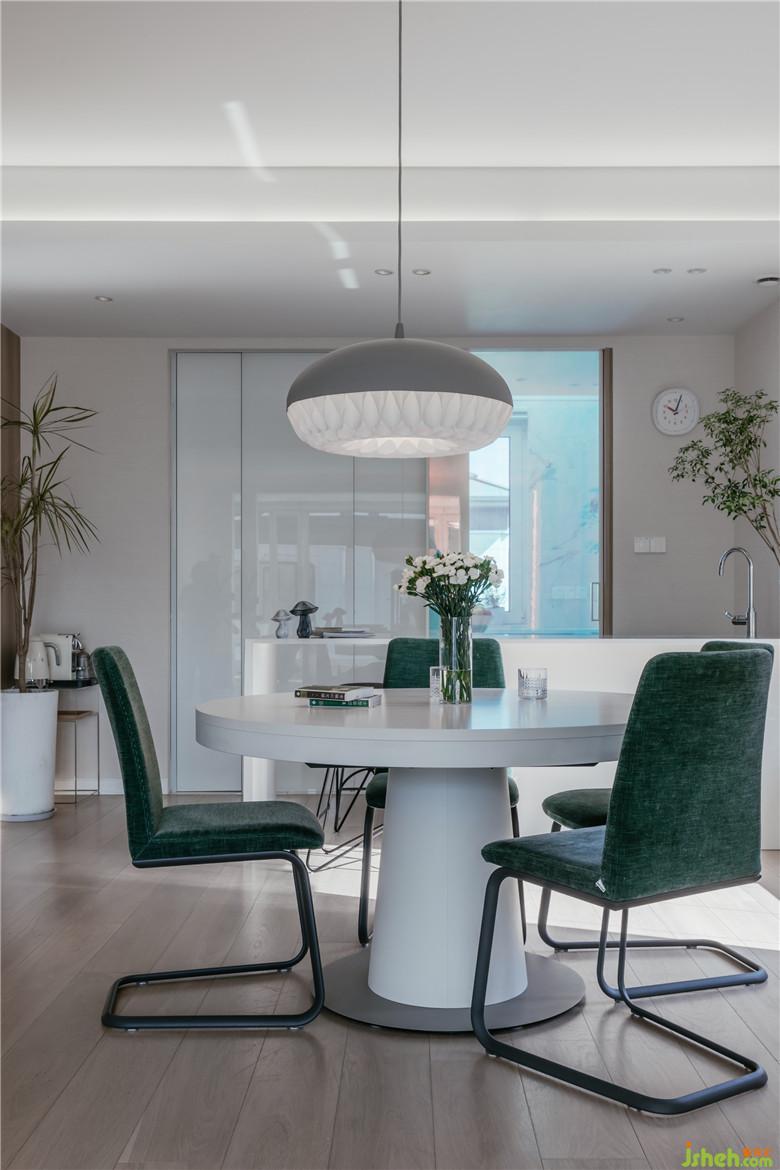 餐廳是綠色清新色調(diào),簡單的花木替代繁復華麗的插花,素樸中由近及遠地透著點點層次,呈現(xiàn)安靜自然的詩意。一盞別致的吊燈呼應圓桌,提升空間關(guān)系變得愈加飽滿。