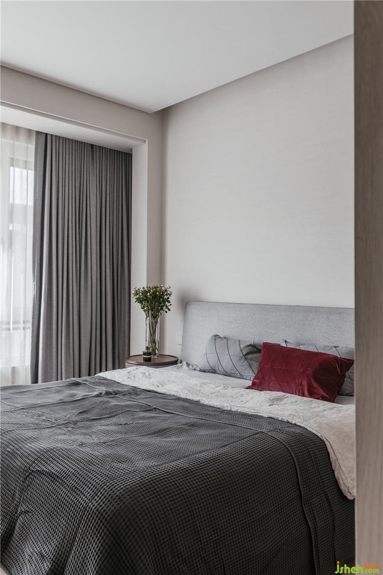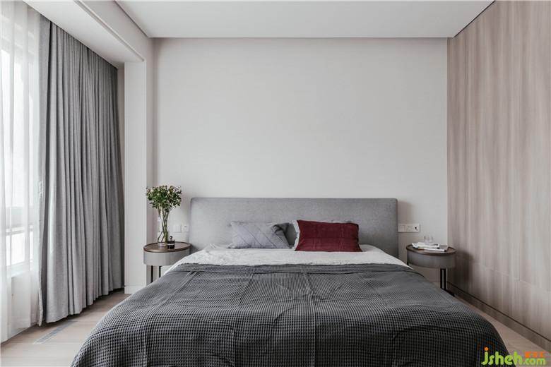 主臥的整體色彩沿用灰白色和木色,原木的自然親和平衡著內(nèi)在情緒,更利于營(yíng)造睡眠的氛圍。