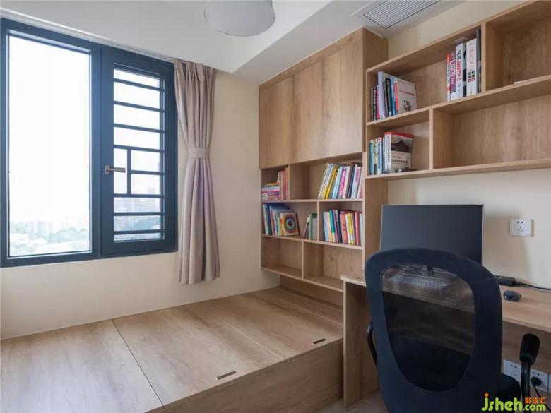 榻榻米房間,延續(xù)了簡潔大方的特點,具有收納的功能,同時也是一間書房。男業(yè)主經(jīng)常國內(nèi)外出差,有時候還需要到家里辦公,設(shè)計師根據(jù)業(yè)主的訴求,定制設(shè)計了收納和書架相結(jié)合的榻榻米柜子,滿足了現(xiàn)下家庭居住和辦公需要。