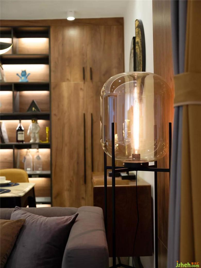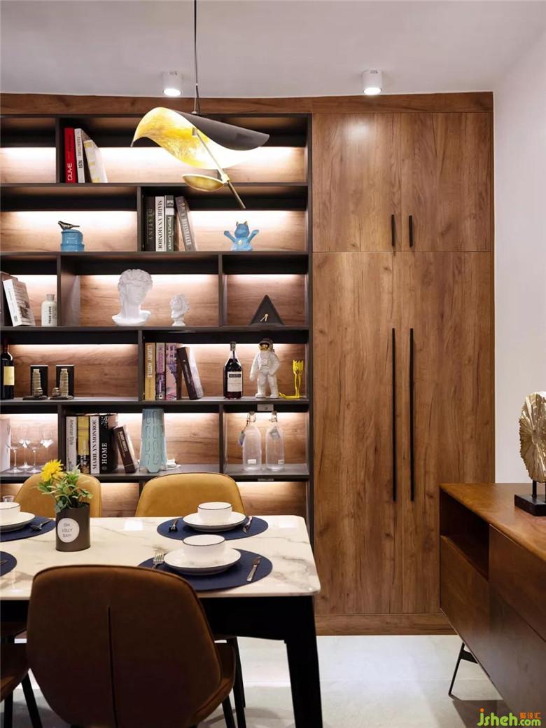 餐廳和客廳在同一空間,卻不顯突兀??蛷d與餐廳天花中間的木質(zhì)吊頂,讓客餐廳功能區(qū)分更加清晰。餐桌上方的燈是業(yè)主淘回來的復(fù)古吊燈,金屬的銅片,暖黃的燈光,是一份歸家的安心。設(shè)計師新設(shè)計了木質(zhì)紋理的置物架,打造充滿質(zhì)感的落地書架,可以放置書籍和業(yè)主從世界各地淘回來的展示品。裝修設(shè)計