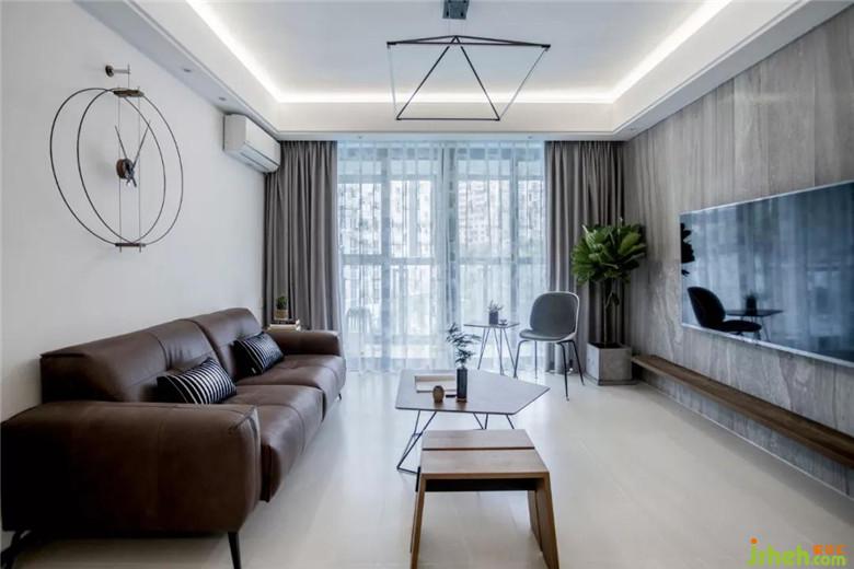客廳陳列簡單,簡潔柔和的線條感簡化空間,看上去簡單大氣。軟裝設(shè)計中以男性的心理視角整體基調(diào)選用了冷色調(diào),淺色高級灰給人清冽硬朗的感覺,簡單的家居時鐘以及裝飾吊燈都在以極簡單的線條和質(zhì)地,突顯時尚感。