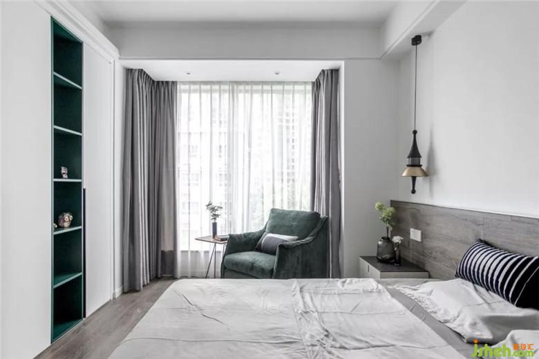 臥室是一個最能體現(xiàn)屋主喜好的一個場所,所有的設(shè)計都圍繞男女主人展開的,墨綠色的開放柜、個性有趣的吊燈、綠色的單椅、顏色豐富的擺件,讓明快的空間增添了的復(fù)古氣息,彰顯了屋主的生活理念。