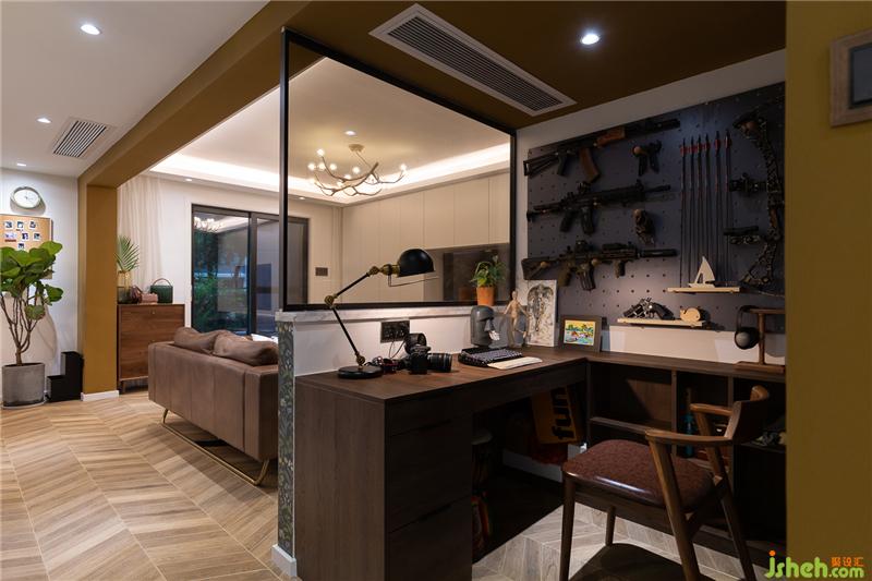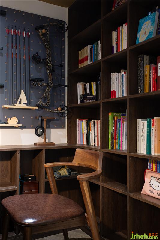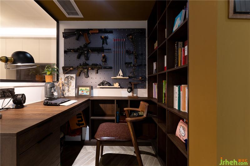 書房由原戶型的餐廳改造而來(lái),打破墻體的束縛,與客廳一窗之隔,半墻茶褐色玻璃代替墻體,既能引入客廳的光源,讓小小的書房變得通透許多,也加強(qiáng)了書房與客廳的空間互動(dòng)。
