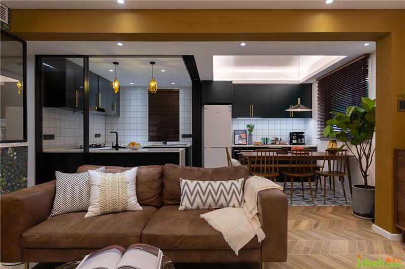 打通原始戶型中廚房的墻體,采用開(kāi)放式廚房的設(shè)計(jì),黑色邊框的玻璃折疊移門分隔廚餐廳,不遮擋光線,也方便客餐廳之間的溝通。